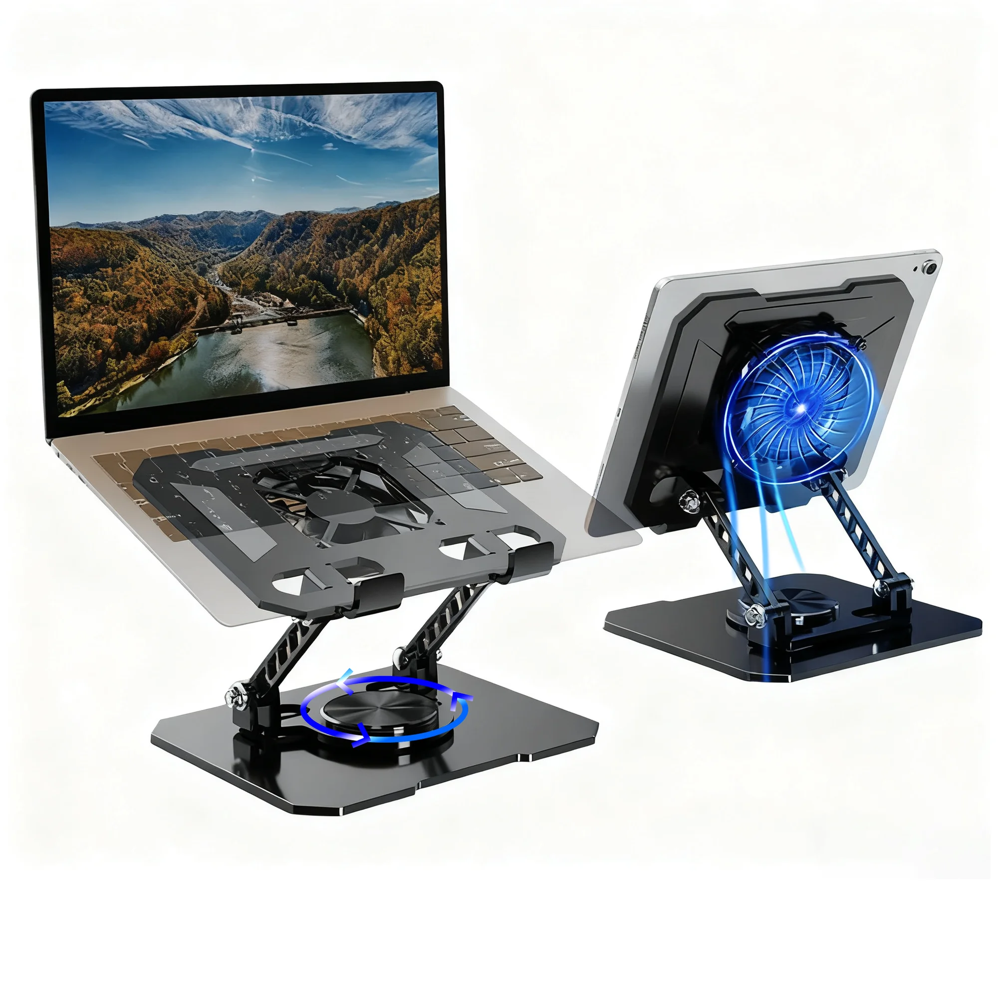 The TIKBBRMG laptop stand provides a sturdy and ergonomic solution for desk setups. Made with aluminium alloy for durability and stability. Features a quiet built-in cooling fan to prevent overheating during extended use. Multi-angle adjustable height allows comfortable typing and viewing positions. Compatible with most laptops, including PCs and notebooks. Lightweight and portable for easy transport between workspaces or home. Helps improve airflow, reduce strain, and enhance laptop performance. Perfect accessory for students, professionals, and gamers seeking comfort, cooling, and stability in one stand.